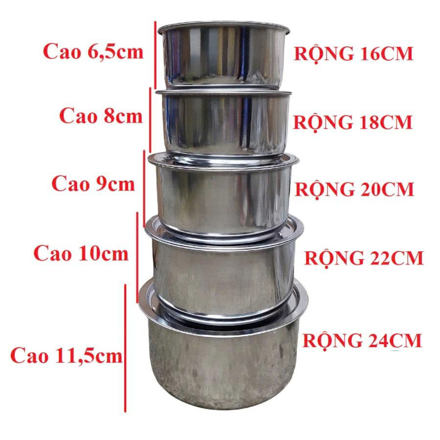 - Đa dạng kích cỡ: Gồm 5 nồi với các kích cỡ khác nhau, từ nhỏ đến lớn, thuận tiện cho nhiều mục đích nấu ăn khác nhau như luộc, hấp, kho, ninh, hầm hay nấu canh.