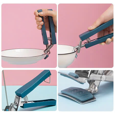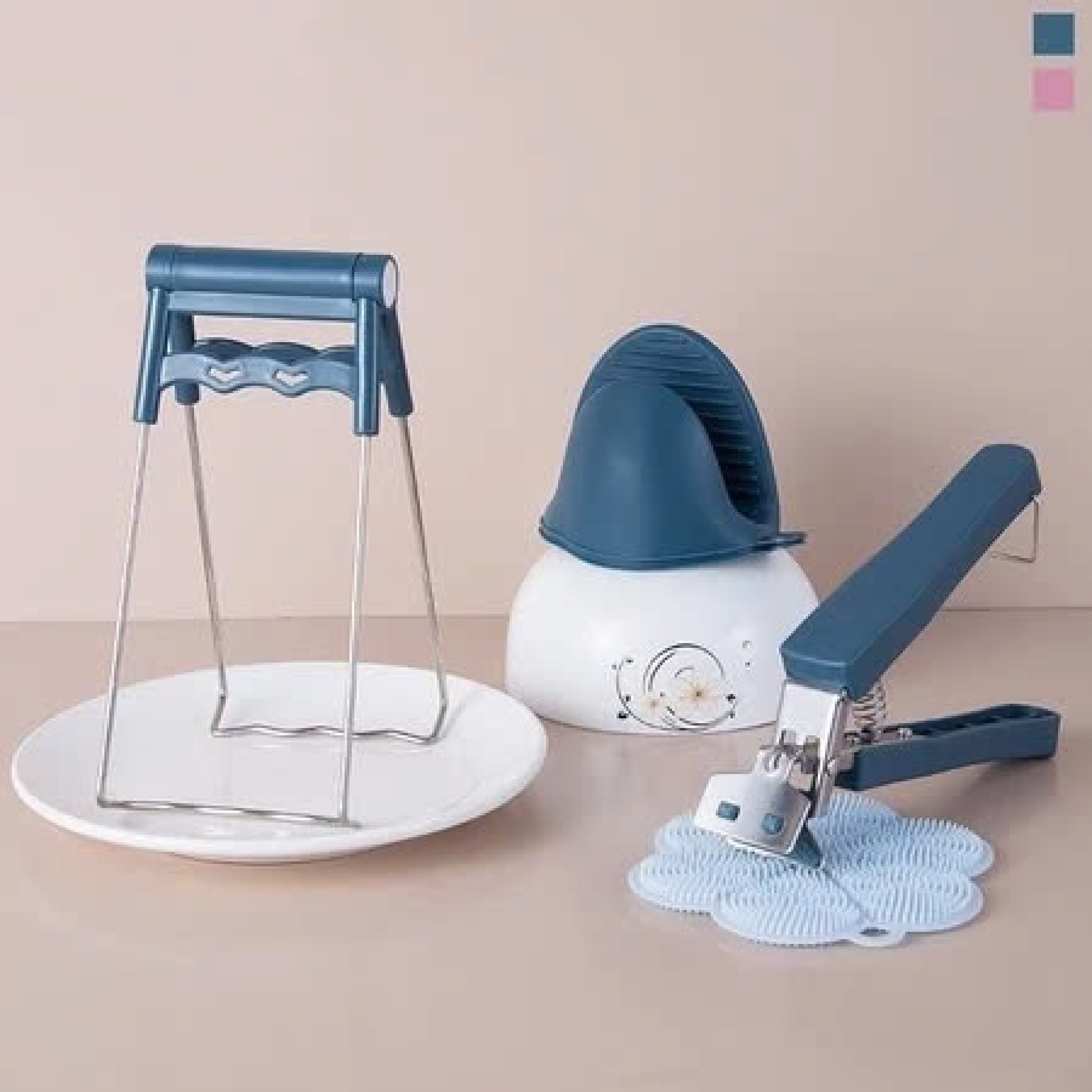- Bộ sản phẩm bao gồm 6 chi tiết: 1 kẹp gắp đĩa, 1 kẹp nhấc bát, 2 lót tay hình mỏ vịt và 2 miếng rửa bát gai silicone