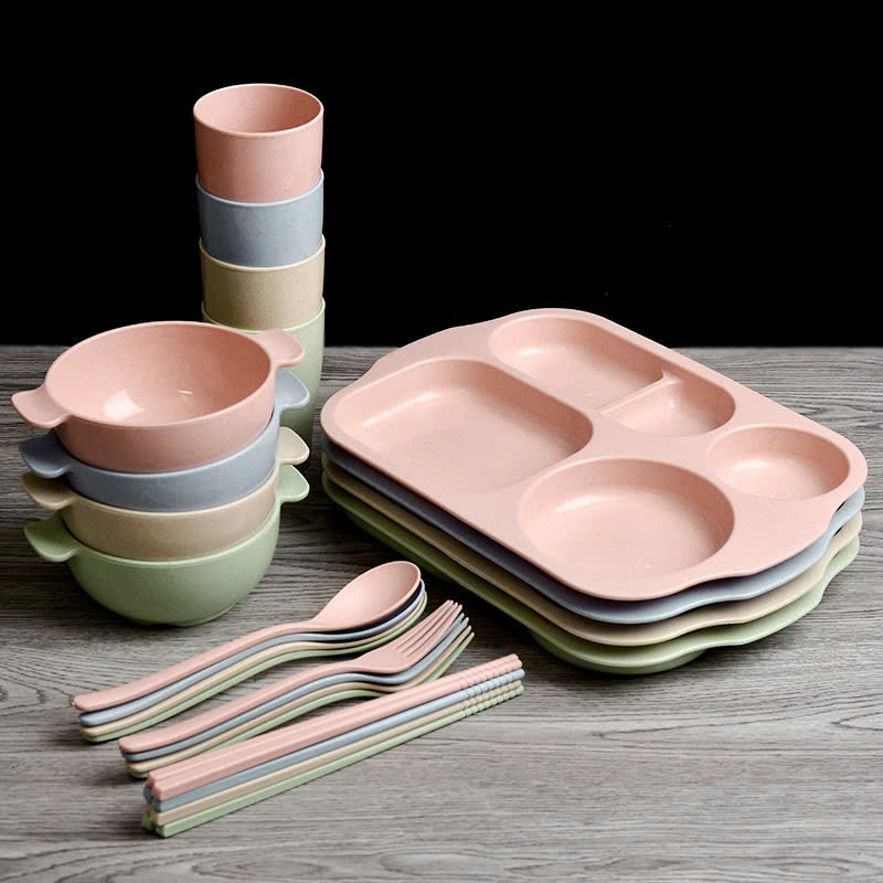 - Khay ăn dặm lúa mạch bao gồm: 1 khay + 1 bát + 1 cốc + 1 thìa + 1 đôi đũa + 1 dĩa