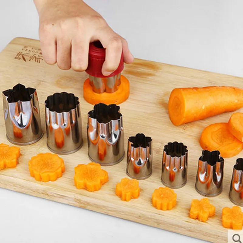 - Việc bạn cần làm đơn giản chỉ là ấn khuôn vào lát hoa quả có sẵn ( dày, mỏng tùy món), lấy ra thì có ngay các loại hoa đẹp mắt