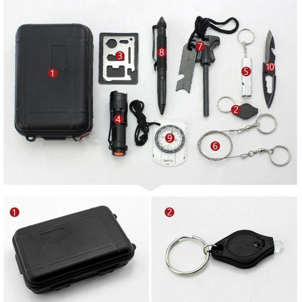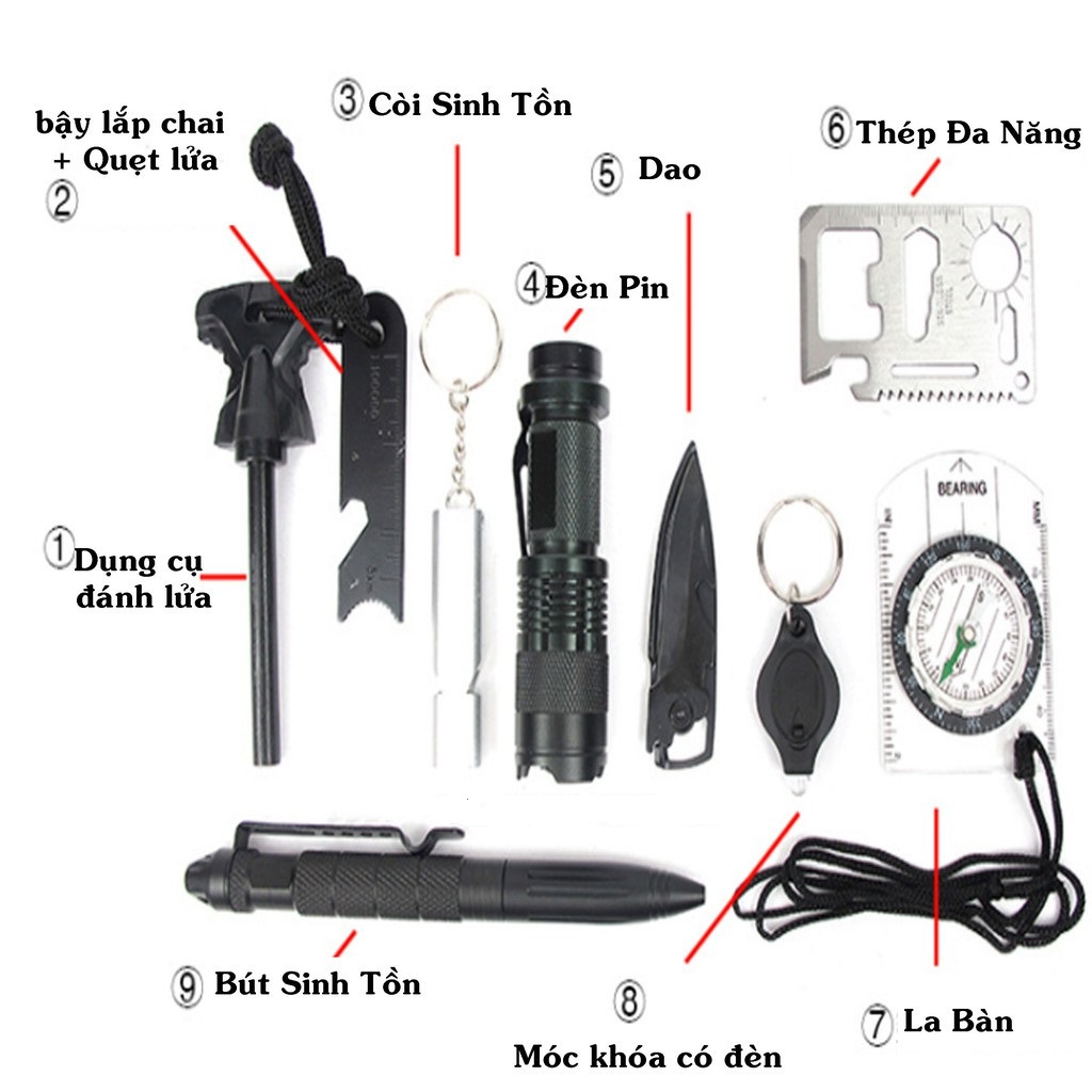 - Bộ dụng cụ sinh tồn SOS 10 món này lý tưởng cho tất cả các hoạt động ngoài trời.