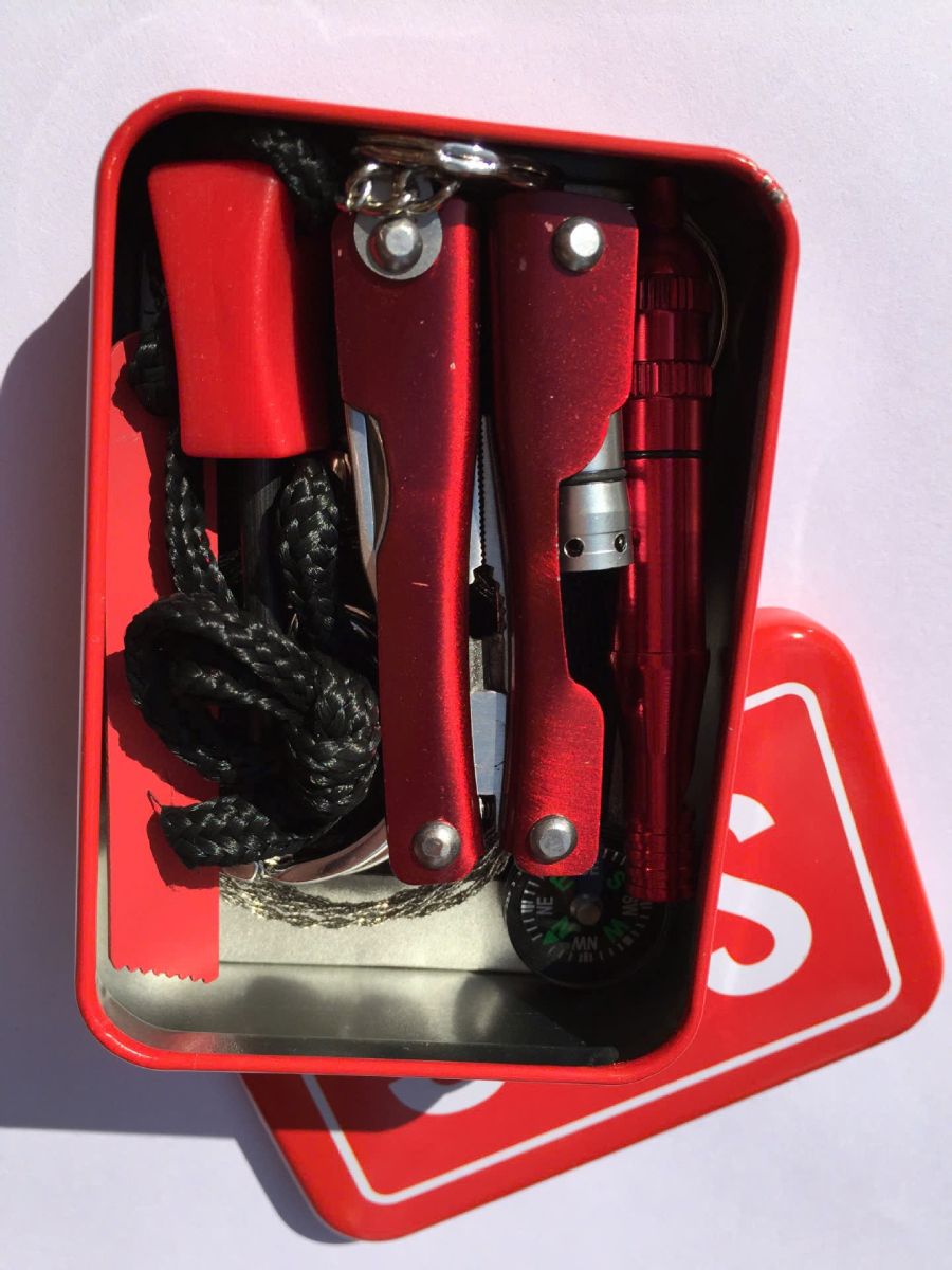 - Bộ dụng cụ sinh tồn SOS bao gồm: bộ kìm đa năng như đèn pin, dao nhỏ, cưa nhỏ, kìm, đánh lửa, la bàn, dây cưa cầm tay, móc nhôm leo núi, dao đa năng.