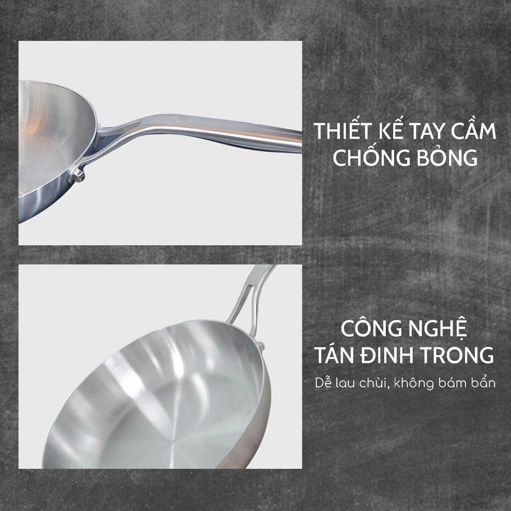 Lớp giữa là nhôm 1050 nguyên chất có tính dẫn nhiệt rất tốt, giúp tiết kiệm nhiên liệu và thời gian tối đa khi nấu. + Lòng nồi chảo là inox cao cấp 18/10, bền chắc và sáng bóng theo thời gian, có khả năng chống dính tự thân giúp chiên xào đồ ăn không bị sát, dính, cũng không sinh ra các chất độc hại trong quá trình sử dụng, an toàn tuyệt đối cho sức khỏe.