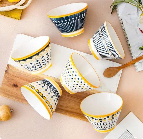 - Bát sứ hình nón thu hút mọi ánh nhìn bởi hoa văn độc đáo được vẽ tay tỉ mỉ. Những họa tiết hình học xanh dương kết hợp với điểm nhấn màu vàng tươi sáng tạo nên bức tranh sinh động trên nền sứ trắng tinh khiết. Viền vàng óng ánh chạy dọc theo miệng bát không chỉ tăng thêm vẻ sang trọng mà còn tạo sự hài hòa với tổng thể thiết kế.