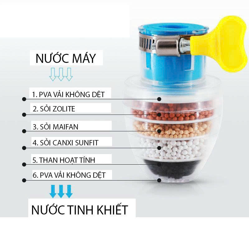 - Cấu tạo và nguyên lý hoạt động: Đầu lọc nước 6 tầng được thiết kế với 6 lớp lọc chuyên biệt, giúp loại bỏ triệt để các tạp chất, vi khuẩn và hóa chất độc hại trong nước, cụ thể như sau: