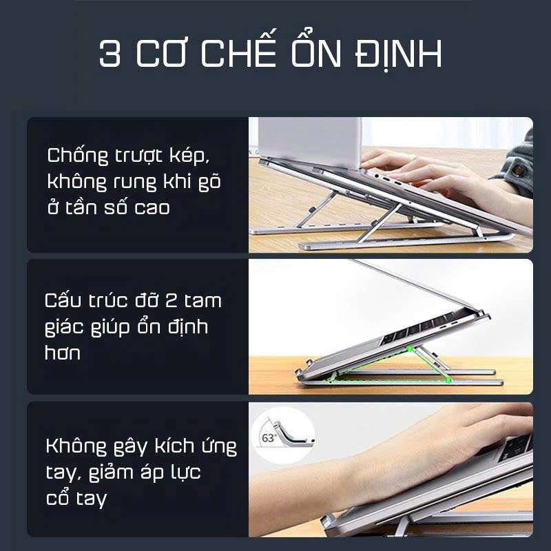 - Sản phẩm có chất liệu nhôm nguyên khối, được gia công tinh tế, chắc chắn đảm bảo laptop, macbook cố định chắc chắn, không bị rung lắc.