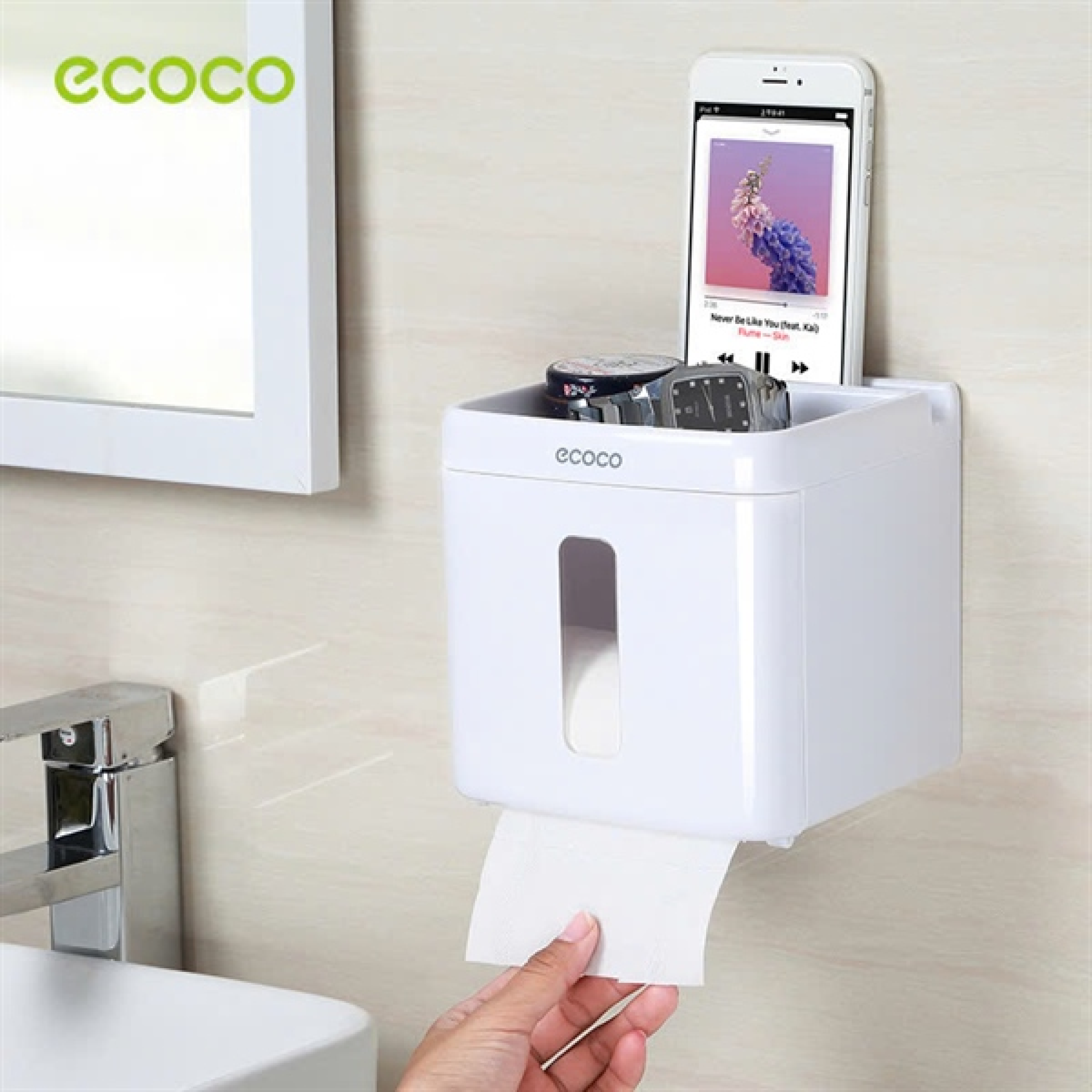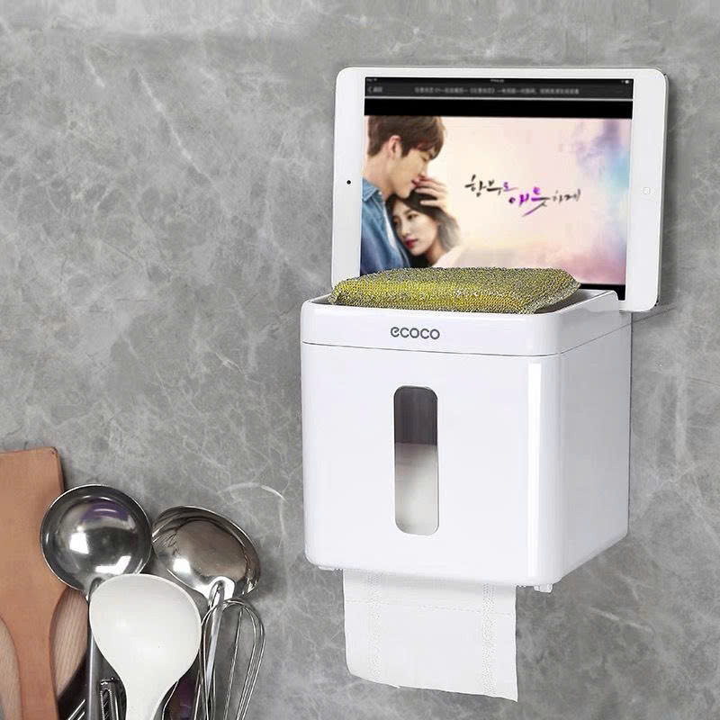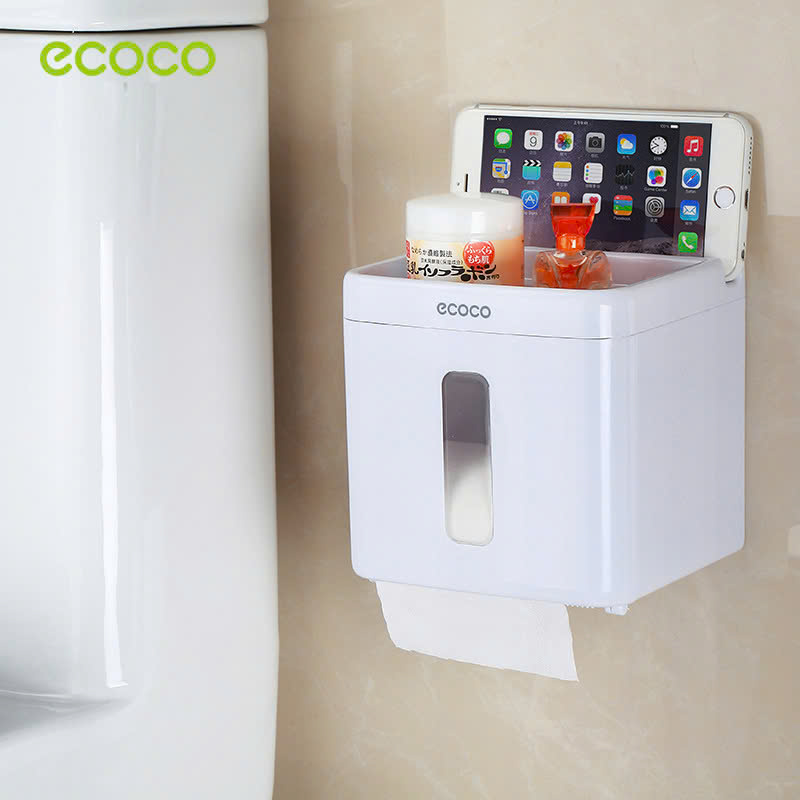 - Hộp đựng giấy vệ sinh Ecoco được thiết kế chống nước, chống trơn trượt, chống rơi và đặt/ để được nhiều vật dụng hàng ngày. Ngăn sau cùng được thiết kế riêng để điện thoại di động hoặc máy tính bảng.