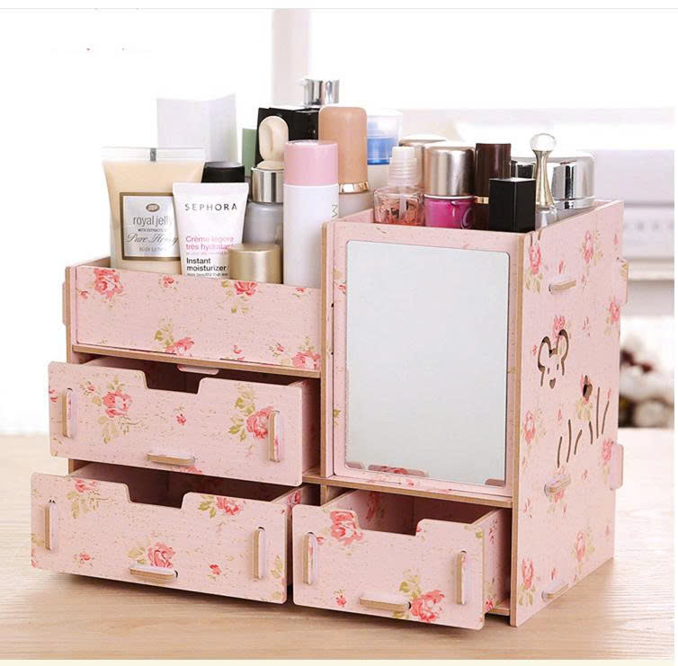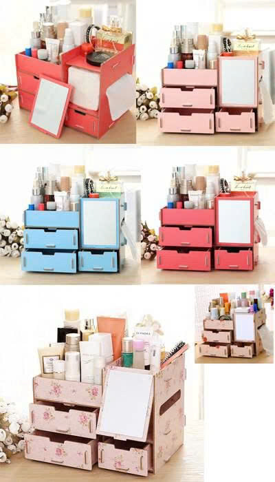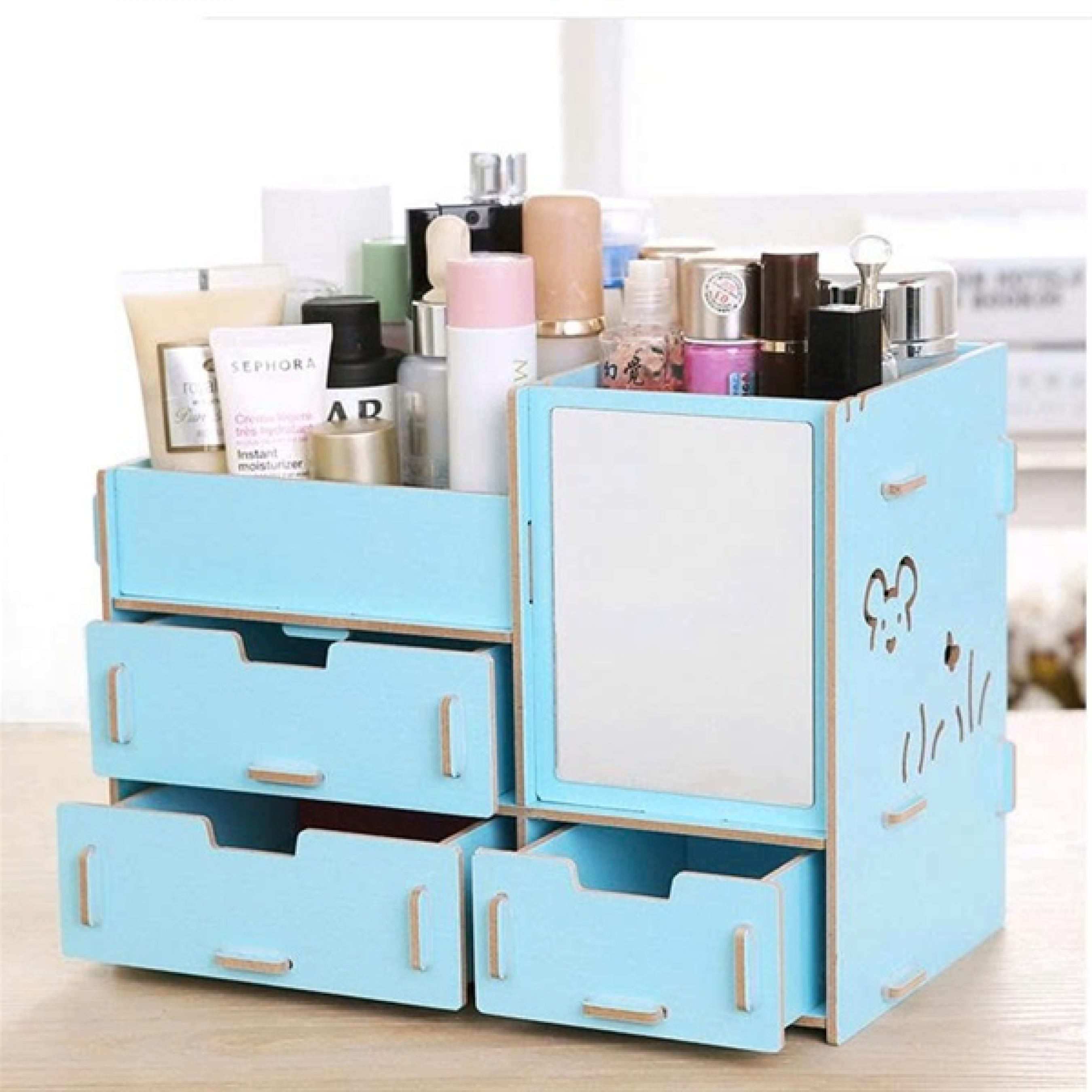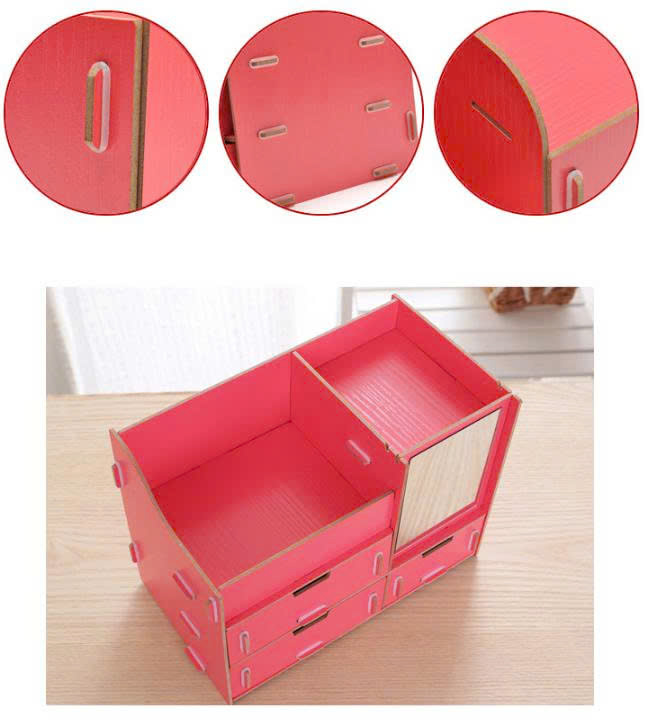 - Với thiết kế thông minh gồm các hộc nhỏ để các loại chai lọ, mỹ phẩm ngăn trên như cọ, nước hoa, chải my, son cây...