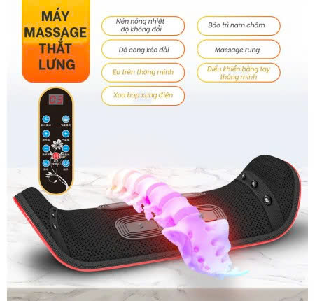 - Máy massage keo cột sống làm giãn thắt lưng giúp cột sống trở lại hình dạng tự nhiên, làm giảm những cơn đau nhứt khi làm việc cả ngày và còn nhiều lợi ích không ngờ mà nó mang lại, máy còn có tác dụng làm giảm thoái hoá đốt sống lưng, đốt sống cổ, hỗ trợ điều trị thoát vị đĩa đệm. Chỉ cần nằm thư giãn 15 phút mỗi ngày bạn sẽ cảm giác sảng khoái và khỏe mạnh hơn rất nhiều với cơ chế massage nâng, kéo dài đốt sống thắt lưng để giải mỏi cho cơ bắp của bạn. Máy massage được tích hợp mô đun sưởi ấm, việc massage được thực hiện bởi hệ thống kiểm soát nhiệt động thông minh, có thể điều chỉnh nhiệt độ dễ dàng làm giảm đau hiệu quả và thúc đẩy lưu thông máu ở thắt lưng.