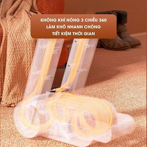 - Khí nóng 3 chiều xoay 360 độ giúp làm khô giày toàn bộ nhanh gấp 1,5 lần máy thường.