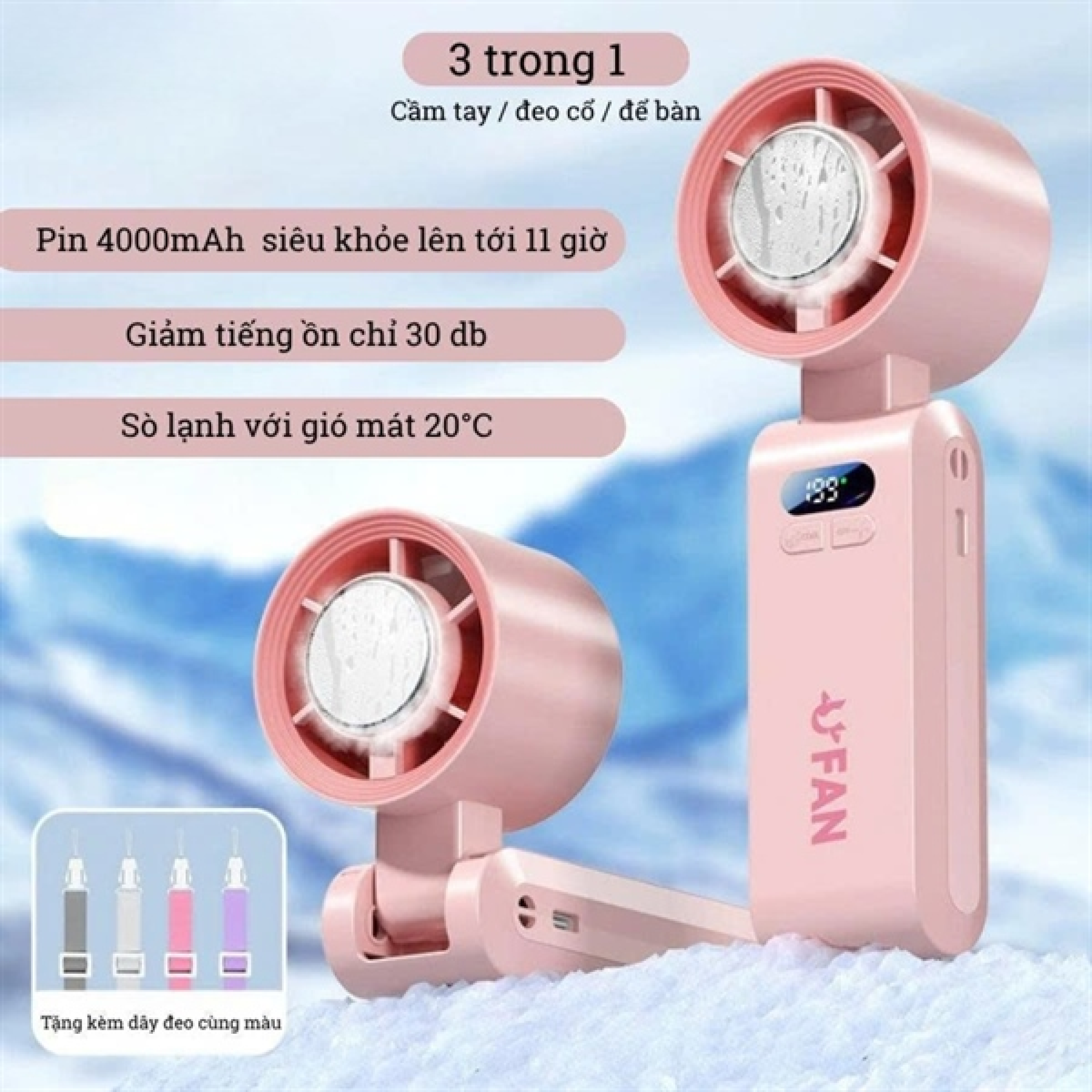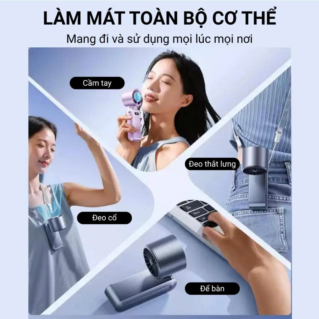 - Trọn bộ gồm: Quạt + Cáp sạc + Hướng dẫn + Dây đeo