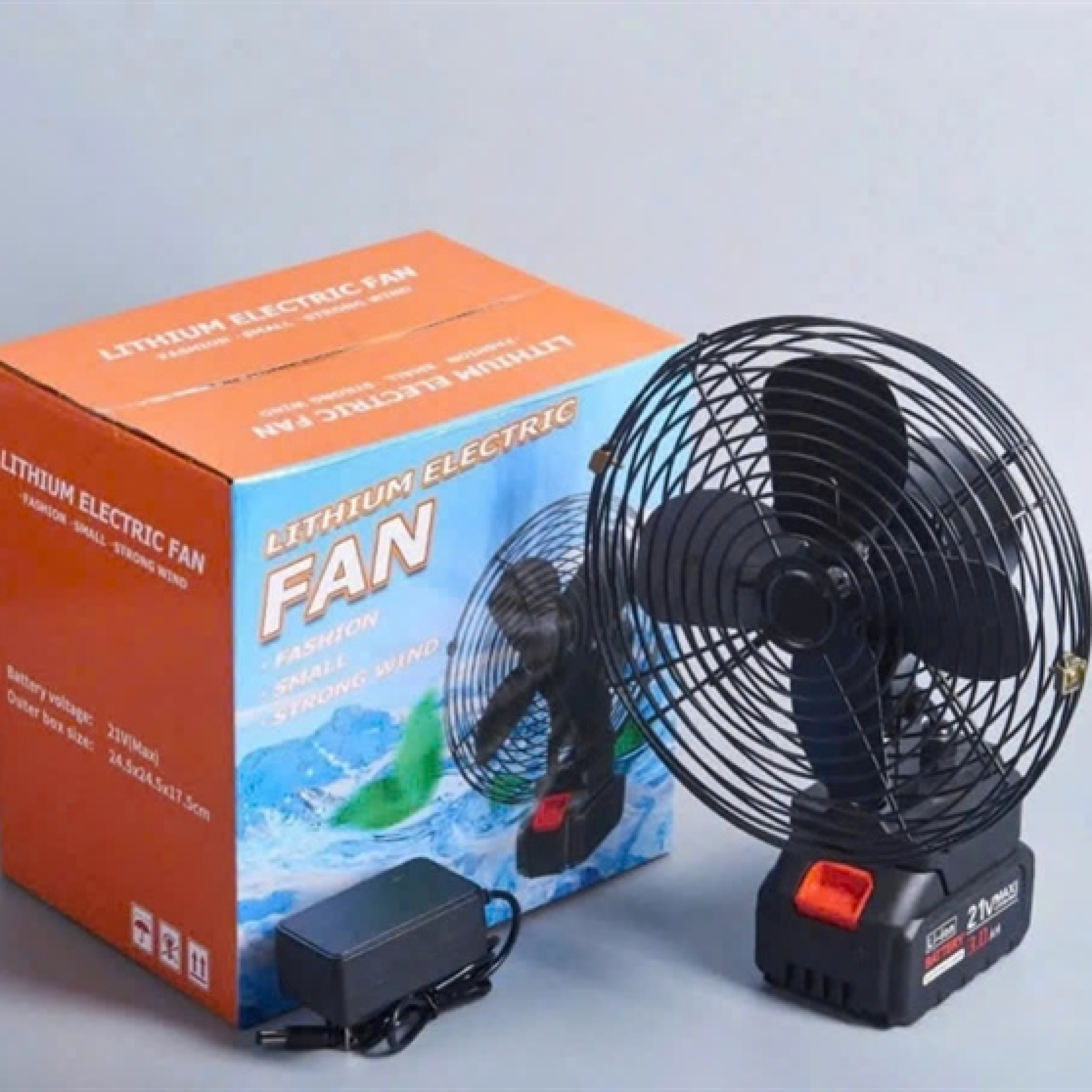 - Bộ sản phẩm gồm: 1 Thân quạt tích điện + 1 pin lithium 10Cell + 1 sạc 21V